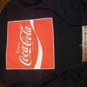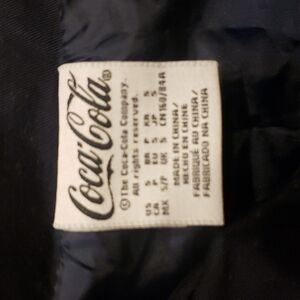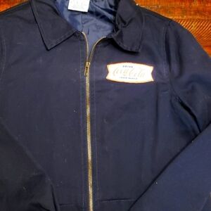 in new condition. size small. navy blue with Coke patch on chest and large one on the back. fully lined. zip front. no pockets
