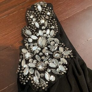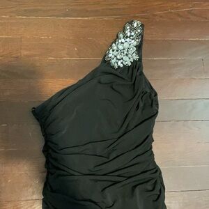 Good condition, only worn once - Junior's Deb One Shoulder Beaded Ruched Formal Dress - Homecoming Or Prom. Has beaded design on left shoulder and ruching along the side of the dress. Color: black. Size: M (material has stretch to it).