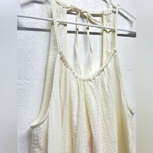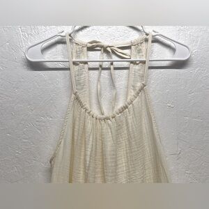 This swim cover-up is adorned with a crinkled texture for a pretty look, which is elevated by the ruffle hemline that lends fluttery charm. The sleeveless cover-up dress has a gathered detail on the front neckline and thin shoulder straps with behind-the-neck trailing ties for a secure fit, as well as a deep U-neck at the back for peek-a-boo flair.