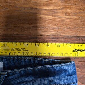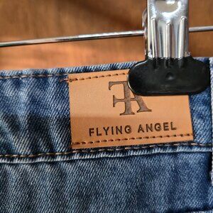 Juniors Flying Angel brand Denim Maxi Skirt size 13/31 never worn. Nice medium blue color (best represented in pic with size tag) with factory fading. Two front pockets and two rear pockets. Measured flat, waist 16.5 inches, length 37" total. Slit in front and patched V in back, raw hem, (all factory).85% Cotton,12%Polyester 2% Viscose.