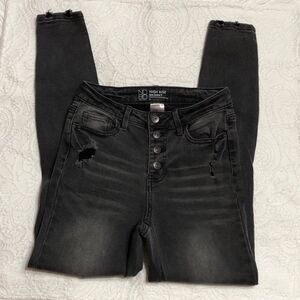 Juniors High Waist NO Boundaries Jeans Size 3 Distressed Gray and Black, Button Fly, Cut out Knees, Skinny Jeans,