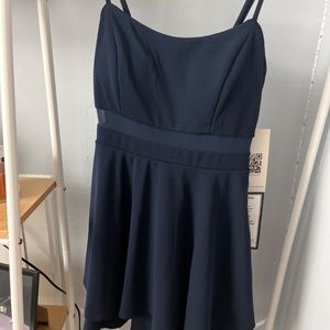 Navy blue, short dress. Mid section has net see thru area - modest yet modern.