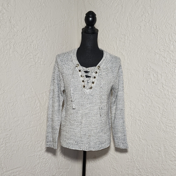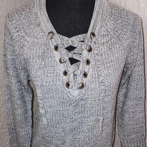 Stylish gray sweater with lace-up front detail. Perfect for casual wear.