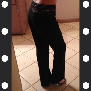 Black juniors dress slacks. Medium rise with black & pink design at waist. Not necessarily a straight leg, because they taper at the knee.