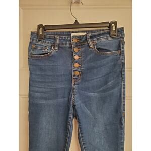 Excellent condition, women's/junior's Nature Denim darkwash skinny jeans with a button fly and frayed ankles. These jeans stretch!