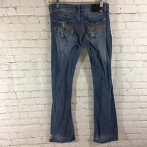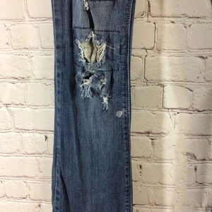 Juniors Red Rivet distressed medium wash denim blue jeans. There is floral printed fabric behind the rips. Traditional five pocket style with zip and button closure. Size 5. Made of a cotton / spandex blend so there is some stretch to them. Machine washable. Great pre-owned condition.