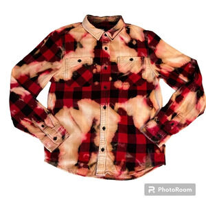 Unique and one of a kind hand bleached plaid button up shirt. Juniors XL but I would also say that it would compare to a women’s Xs/Sm. Please view measurement photos. No tears or holes. Has a 90’s grunge/punk look or would look cute with a pair of leggings for fall. Photos are of actual item so please view each one for description and cosmetic detail. Tag and size photos also included.