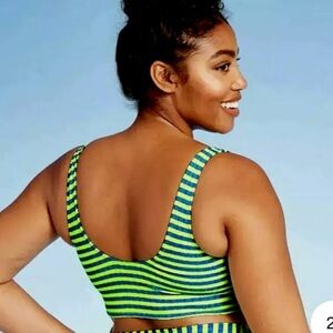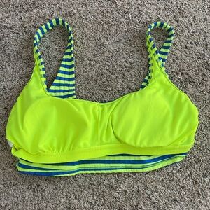 Fluorescent green/yellow and blue stripes. Ribbed material. Has removable cups.