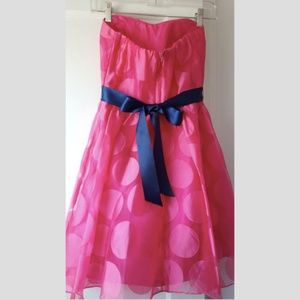 Pink polka dotted strapless dress. The top is structured and has padding sewn in. There is also extra hooks around the bodice to keep the dress from falling down. The back also has an elasticized band. Can be worn for junior prom, homecoming, weddings, formal parties, etc. Waist 26 inches, Bust 31.5 inches.