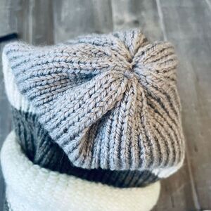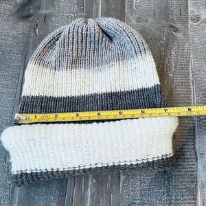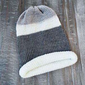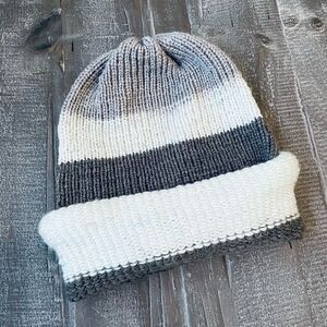 Handmade gray and white stripe knit crochet winter beanie hat in new condition. Kids/juniors size, see photos for measurement. Has some (limited) stretch. Clean nonsmoking home.