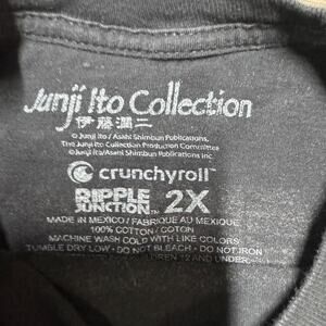 The Junji Ito Men's 2XL Long Sleeve Double-Sided Horror Manga Anime Dear Ancestors t-shirt is a black cotton shirt featuring a graphic print of characters from the Junji Ito Collection. The shirt is machine washable, made with a knit fabric type, and has a crew neck with a regular fit. With a theme of anime, horror, and manga, this shirt is perfect for fans of dark and supernatural storytelling, featuring Risa as a prominent character.