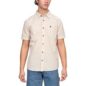 Step up your casual style with this effortlessly cool short sleeve button-down shirt from Junk Food Clothing, Los Angeles. Crafted from 100% cotton in a neutral beige tone, this laid-back essential features dual chest pockets, wooden-style buttons, and subtle texture for a relaxed yet refined look. Perfect for warm weather or layering with a jacket.