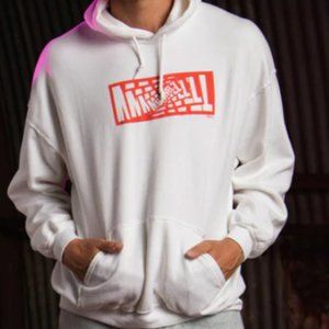 This is a great, slightly worn, hoodie for any Marvel fan. It is super comfy and is a great look as well. More photos are available upon requestion and measurements are