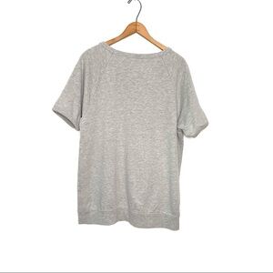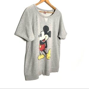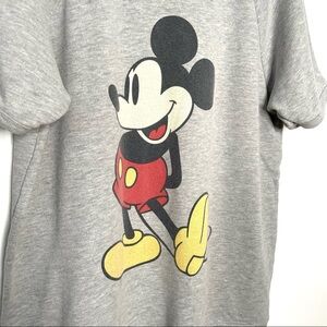 Gray. Mickey Mouse graphic on the front. Short sleeve sweatshirt. No holes, no stains. Slight fading of the graphic. Size L. 22.5” armpit to armpit. 29” length.