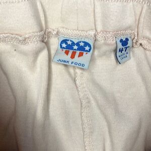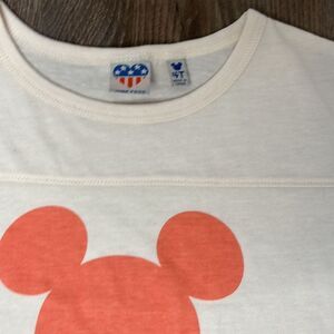 Mickey Mouse tee and printed matching pant set. Top has a screen print of Mickey and embroidery of ‘Mickey’. Pants have small Mickey printed all over them, with raw edge trim. Pants show a little wear, too in excellent condition.