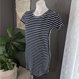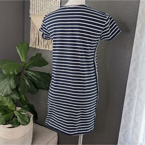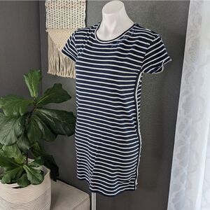 Junk Food navy blue and white striped t-shirt shift dress with "Part in the USA" embroidered around the neckline. Women's size small.