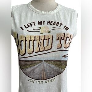Junk Gypsy Company I Left My Heart In Round Top TX Cream and Brown Graphic Tank Top Size Small in very nice used condition. This 100% cotton sleeveless tank top is super light weight and comfy. It is cream colored with a weathered Round Top graphic on the front and the Junk Gypsy logo on the back. Measurements lying flat are approximately 17” inches underarm to underarm and from shoulder to hem approximately 26” inches! Super cute for the Round Top Texas lover in your life 🤠
