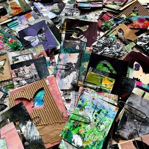 My Junk Journal packs are unique, They may include pieces cut from larger original paintings, recycled papers (magazines, book pages, calendars, ephemera etc), card stock, canvas, fabric, vinyl, plastic, greeting cards, reclaimed product packaging and anything else that I may find unique and interesting..