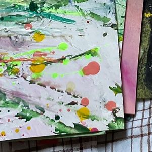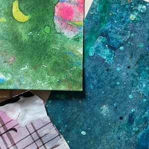 Paints used are acrylics, watercolor, ink, dyes, pastels, oil pastels, mica powders, texture mediums and more.