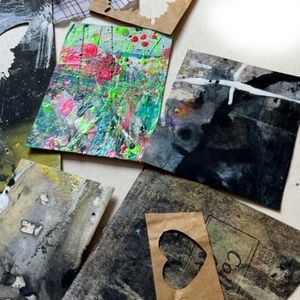 Paints used are acrylics, watercolor, ink, dyes, pastels, oil pastels, mica powders, texture mediums and more.