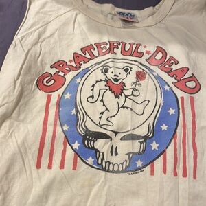 Vintage-Inspired Grateful Dead "Steal Your Face" Bear Tank Top. This cool off-white tank top features a classic Grateful Dead graphic, combining the iconic "Steal Your Face" skull with a dancing bear holding a rose, set against a red, white, and blue stars and stripes background. Perfect for fans of classic rock and a laid-back, retro style!