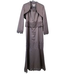 This Junnie Leigh New York dress and bolero set is perfect for a mother of the bride or any special occasion. The dress features a flattering silhouette and the bolero adds a touch of elegance. It's in excellent condition and ready to wear to your next formal event.