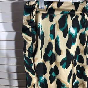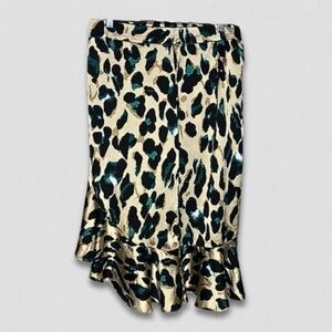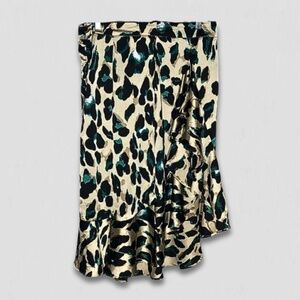 This chic leopard print satin skirt features bold shades of beige, green, and black with a ruffled hem and asymmetrical slit. With a soft sheen and fluid drape.