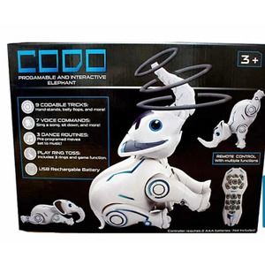 Used twice Great Condition!! Programmable and cod able R/C elephant with voice command moves and tricks. He will sit, do push ups, headstands and say hello. Codo has dance, demo and Ring toss game modes with 3 game rings included.