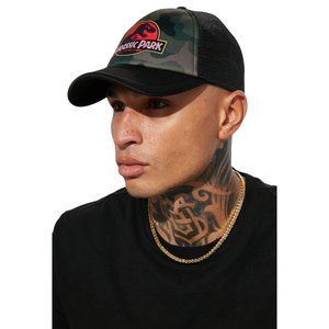 The Jurassic Park Camo Trucker Hat has a constructed structured fit, it's a 5-panel baseball cap featuring insulated mesh rear panels. The hat comes with a plastic adjustable snap back closure. One size fits most