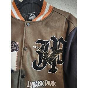 The product is a Jurassic Park "The Lost World" Varsity Jacket in brown and black, size L, designed for men. It features a classic varsity jacket style, making it a versatile and stylish addition to any man's wardrobe. The black brand adds a sleek touch to the brown color, making it a stylish choice for various occasions.