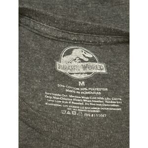 The product is a men's size M distressed T-shirt featuring the Jurassic Park brand. The shirt is gray in color and has a movie and classic theme, making it a stylish choice for fans of the iconic film series. It is a regular fit shirt designed for everyday wear, with a comfortable and trendy style that showcases the Jurassic Park brand. Perfect for men who appreciate casual and on-trend clothing options.
