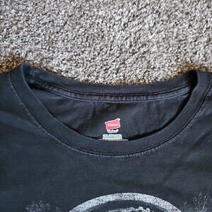 The Jurassic World Adult Tee in 3XL Black is a graphic print T-shirt featuring a crew neck and short sleeves, made of cotton with a knit fabric type. This tee is machine washable and suitable for all seasons, with a theme inspired by dogs. The logo accents add a unique touch to this regular fit shirt from the brand Hanes, perfect for men looking for a comfortable and stylish addition to their wardrobe.