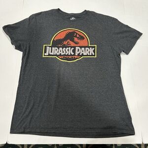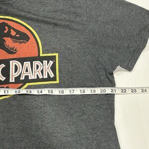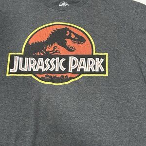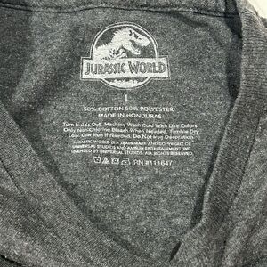 Jurassic World T Shirt Unisex Size L Grey Print Logo good preowned condition does have wash wear and peeling.