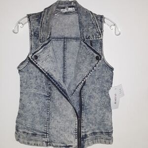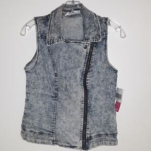 Gray acid wash jean vest. It has a zipper closure that allows you to wear it two different ways and it looks like two different pieces. Very cool and trendy with it's "Vintage" look. Its's new with tags.