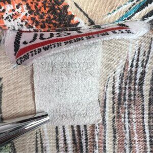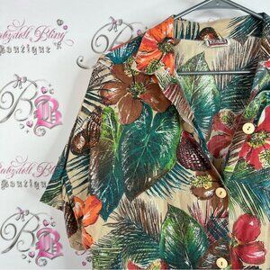Embrace a vibrant look with this tropical floral button-up shirt. Featuring a mix of green, brown, and orange hues, this top is perfect for adding a splash of color to your wardrobe. Vintage. Unsure of exact size see measurement. No tags.
