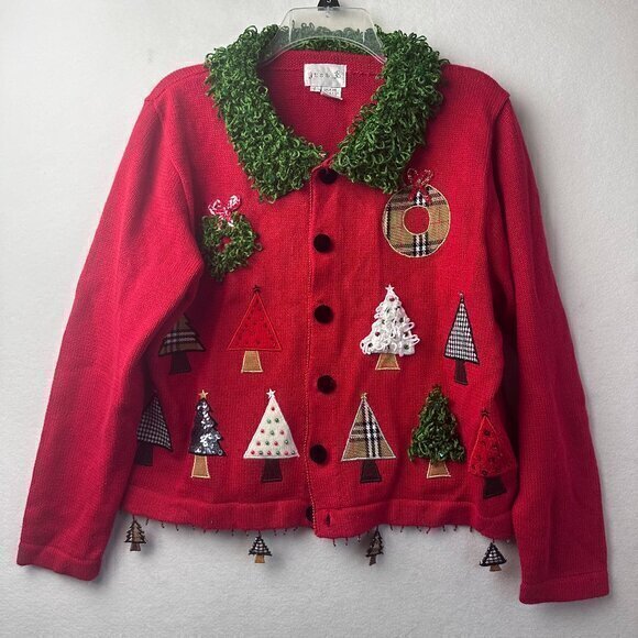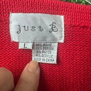 Just B Christmas‎ Cardigan Sweater size L Embroidered Beaded Trees Red Ramie