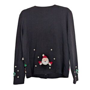 Just B Womens 100% Cotton Black Beaded Santa Not So Ugly Christmas Oversized Lightweight Button Front Cardigan Sweater Size Small