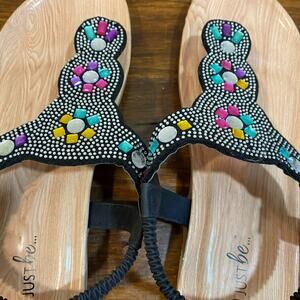 Just Be Rhinestones Sandals Woodgrain Sole Gladiator Elastic in Back Size 8