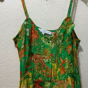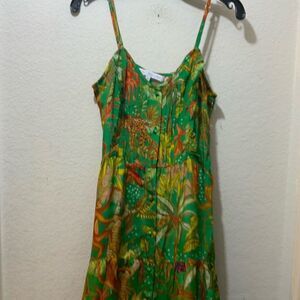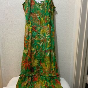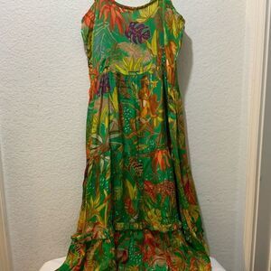 Just Bellini green tropical monkey/leopard print ruffled tiered midi dress.S