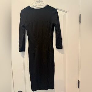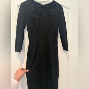 Chic black dress with 3/4 length sleeves. Features elegant lace detailing. Perfect for versatile styling.