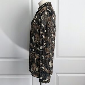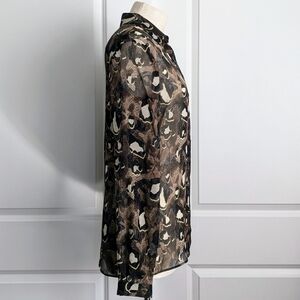 'Botswana' 100% silk. Collared. Hidden button front placket. Long sleeves with one goldtone button closure at cuffs. All-over animal and reptile print. Sheer. Lightweight.