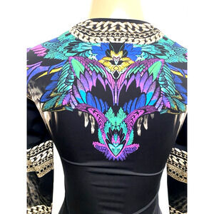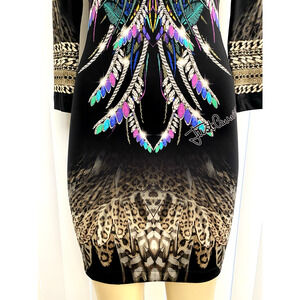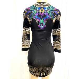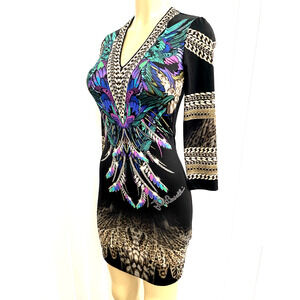 Just Cavalli Dress V Neck Sheath Mini Feather Jewel Print 3/4 Sleeve Black 38 S