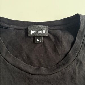 Tags just cavalli black leopard print t shirt mens large graphic tee crewneck short sleeve casual streetwear designer fashion italian brand bold print statement piece cotton fabric relaxed fit edgy style urban wear luxury clothing animal print top versatile outfit premium quality modern design iconic logo comfortable wear trendsetting apparel high fashion casual look
