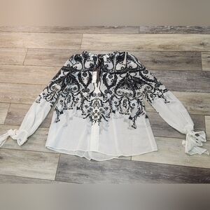 Just Cavalli Patterned Sheer 100% silk Sparkly V Neck Tunic Size Xlarge. New with tags. Perfect for vacation, traveling, resort, or everyday life. I'm a highly rated fast shipper. This elegant women's top features intricate black embroidery on a classic white background. Perfect for adding a touch of sophistication to any outfit.