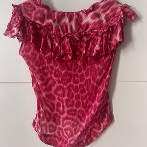 Just Cavalli soft summer top pink leopard print. Ruffles on shoulders, front and back. Dimensions 23” long and 15” across
