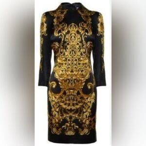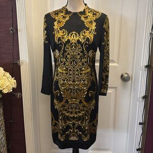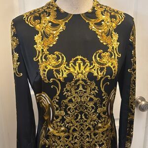 This elegant black and gold dress features a stunning ornate pattern, perfect for any special occasion. Its sophisticated design ensures you stand out with style and grace. New, no tags