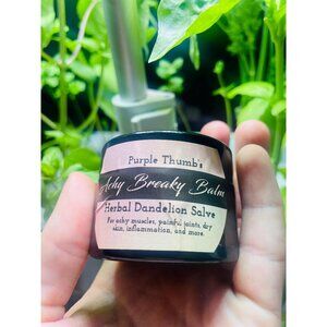 The Achy Breaky Balm is an all natural dandelion salve formulated from my homemade dandelion infused avocado oil, all natural beez wax, and pure castor oil. Yes, those are all of the ingredients and nothing more.