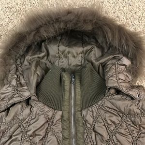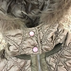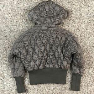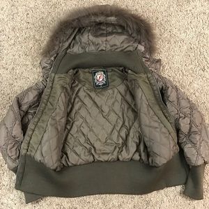 Excellent condition. Polyester. Zip front. Removable hood with snap neck. Front zip pockets. Fitted wrists and waist with relaxed body. Approx.
