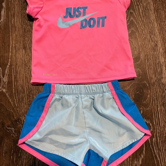 Vibrant pink top with 'Just Do It' logo. Paired with blue shorts featuring pink trim.