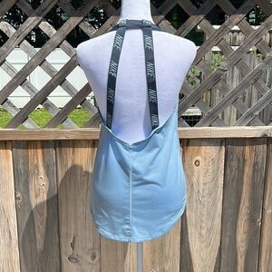 This sky blue tank from Nike has great shoulder straps with the Nike logo. Front is a ghosted showdown font. Straps are elastic.